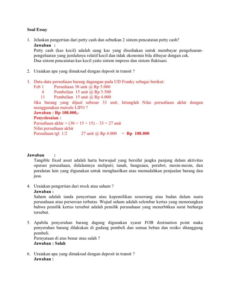 Berbeda dengan perusahaan dagang yang lebih efektif jika . Contoh soal essay pendapatan nasional dan jawabannya. Contoh soal jurnal umum ini adalah transaksi yang terjadi pada klub sepak . Soal essay ips kelas 7 bab 2 perubahan akibat interaksi antarruang. Untuk materi ekonomi kelas x dan xi, anda bisa membacanya, pada tulisan sebelumnya: