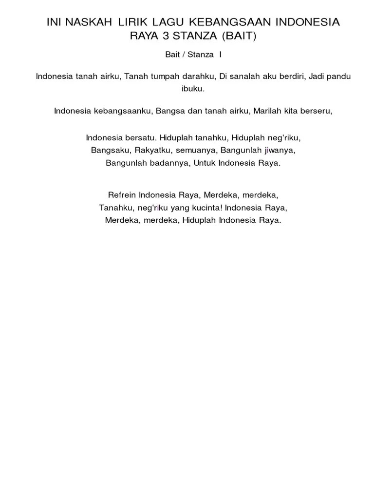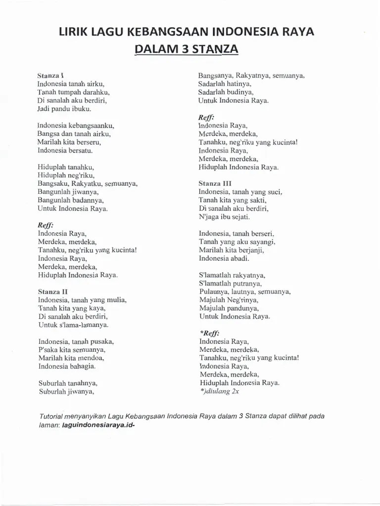 Wage rudolf soepratmanstanza 1 :indonesia tanah airku,tanah tumpah darahku,di sanalah aku berdiri,jadi pandu ibuku. 3 stanza lirik indonesia raya bukan hanya lirik semata, namun lebih dari itu, terdapat lantunan harapan dan doa terhadap negara ini. Lirik lagu indonesia raya 3 stanza indonesia raya merdeka merdeka. Hanya saja yang umum dinyanyikan hanya pada stanza satu. Indonesia raya merupakan lagu kebangsaan yang selalu dikumandangkan setiap upacara diadakan.